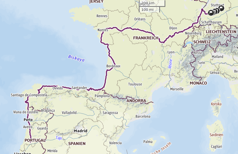 Start 2. Februar 2026 in Ebersbach an der Fils. Weg über Strasbourgh -> Belfort -> Paray-le-Monial -> Nantes -> Bordeaux -> Camino del Norte - Oviedo (Santa Maria del Naranco) -> Foz -> Santiago de Compostella -> Kap Finisterre –> Templerstadt Tomar (Portugal)